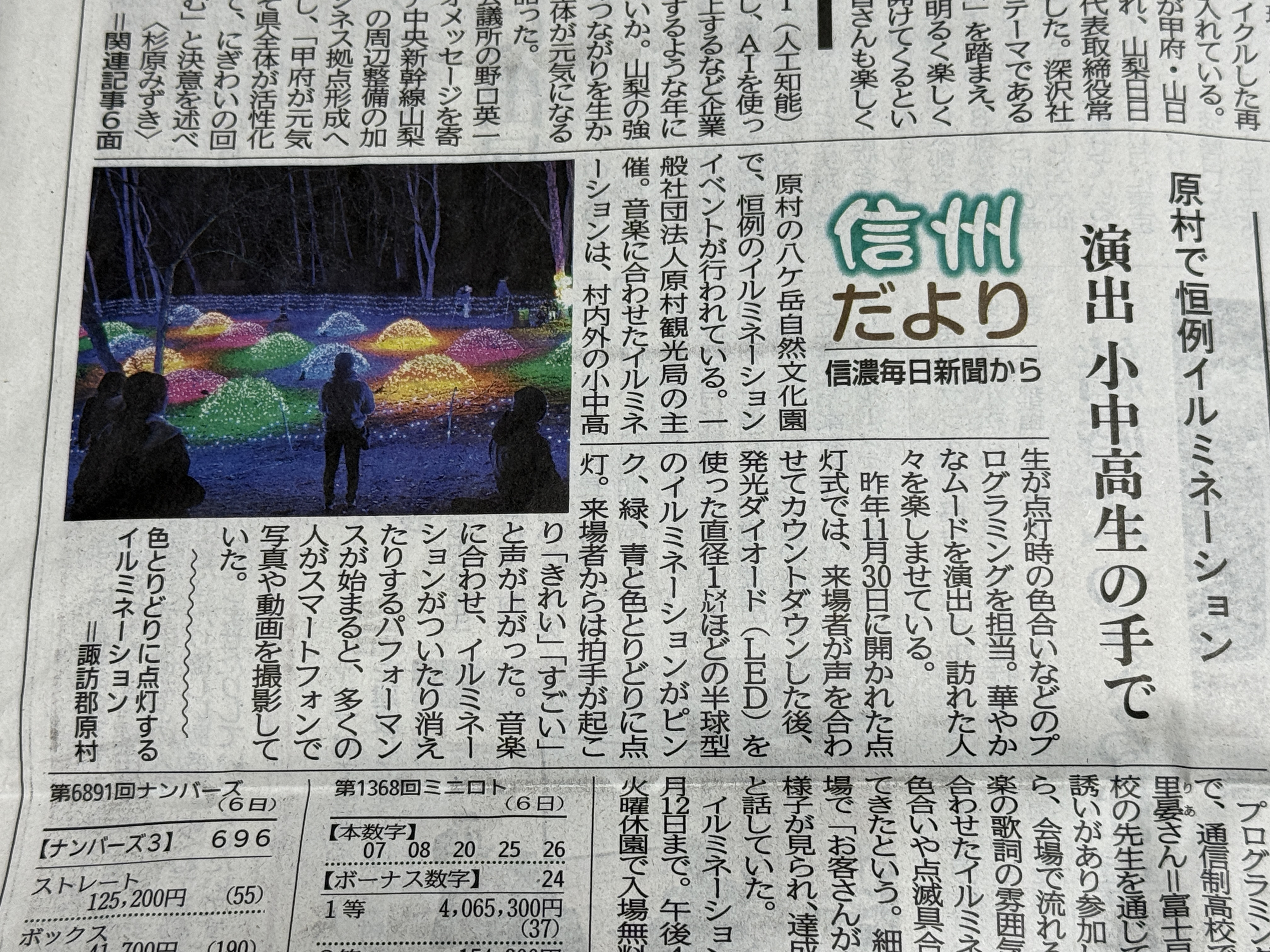 今朝の山梨ローカルの新聞に原村の文化園のイルミネーションの記事が…